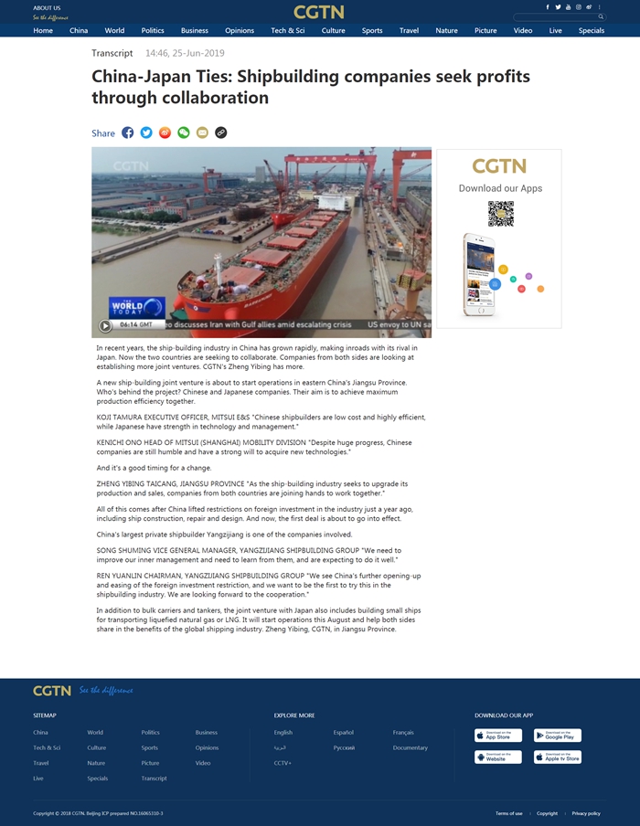 CGTN記者探訪中日船企合作,走進揚子江船業(yè)——合資造船 探索共贏
